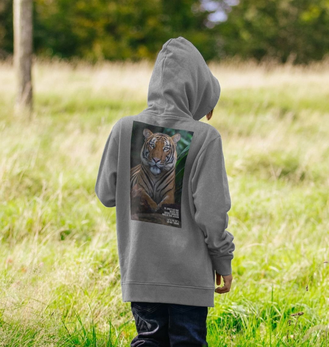 This isn't just a hoodie; it's a cozy way for your little one to connect with the wild! Featured on this Kid's Pullover Hoodie is an incredible, close-up photograph I took of a magnificent Malayan tiger at the sanctuary in Kent.